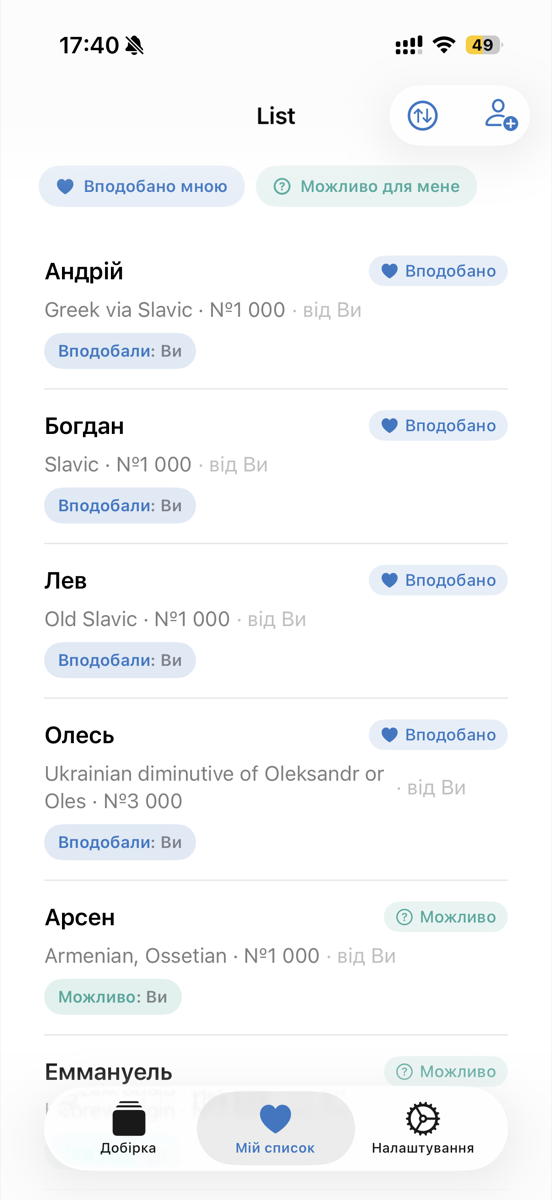 Бачте, які імена подобаються обом, які залишаються під питанням, а які легко відсіяти разом.